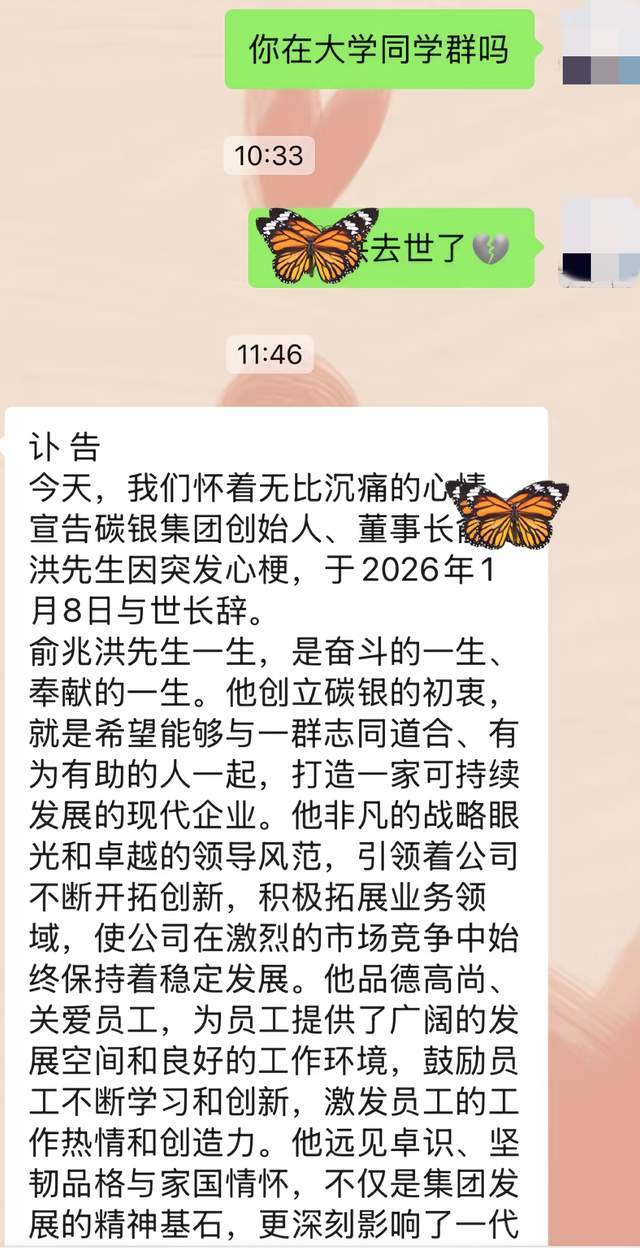 随后,有知情人士晒出“碳银集团”治丧委员会的公告,由此更加证实了这一噩耗。