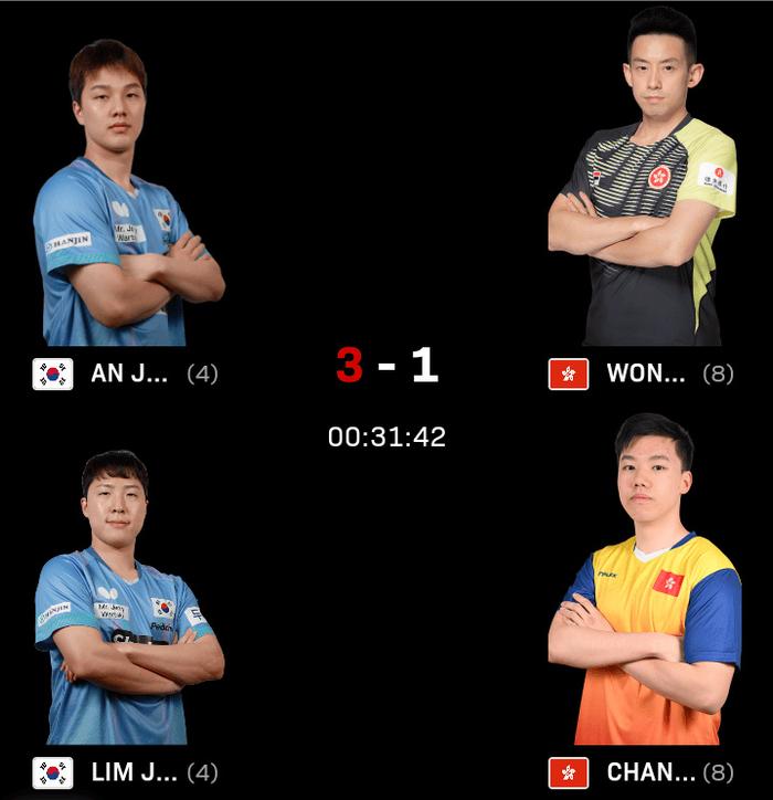 此番对决,首局安宰贤/林钟勋全局无一落后,黄镇廷/陈颢桦一度迫近比分7-7未果,8-11失利。次局黄镇廷/陈颢桦全局无一落后,仅开局3-3,11-6扳回一局。第三局林钟勋/安宰贤全局无一落后,仅开局1-1,局末更是连得四分一举锁定胜局,11-4再下一城。第四局黄镇廷/陈颢桦在10-8领先之下被打一波4-0痛失好局。韩国组合大比分3-1晋级决赛。